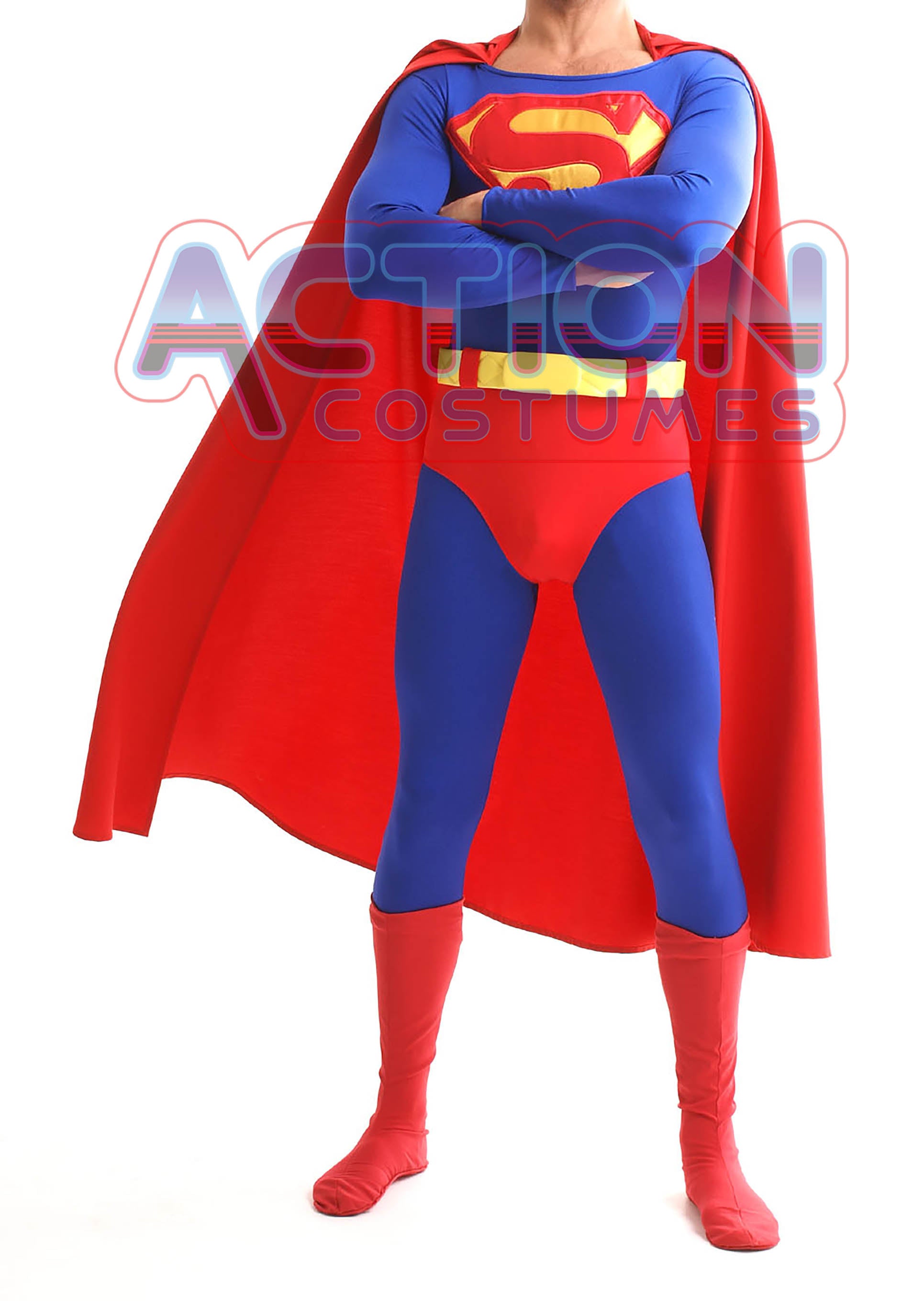 ▪ La Túnica ha sido confeccionada en Lycra spandex de 4 vías azul oscuro (brillante) con el emblema "S" y cremallera trasera, calzoncillos de Lycra spandex rojos unidos a la túnica (con cuatro presillas de Lycra para cinturón).