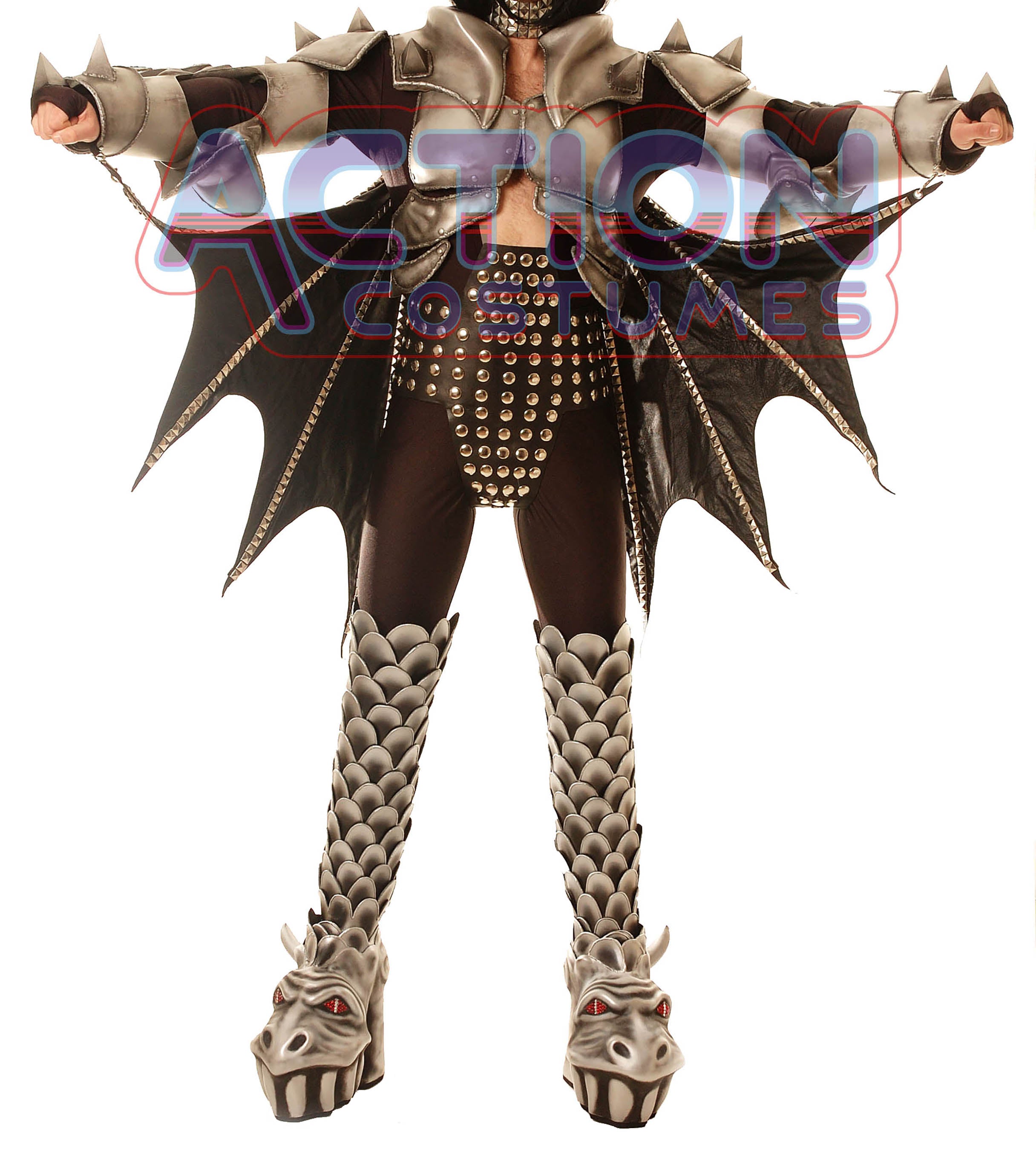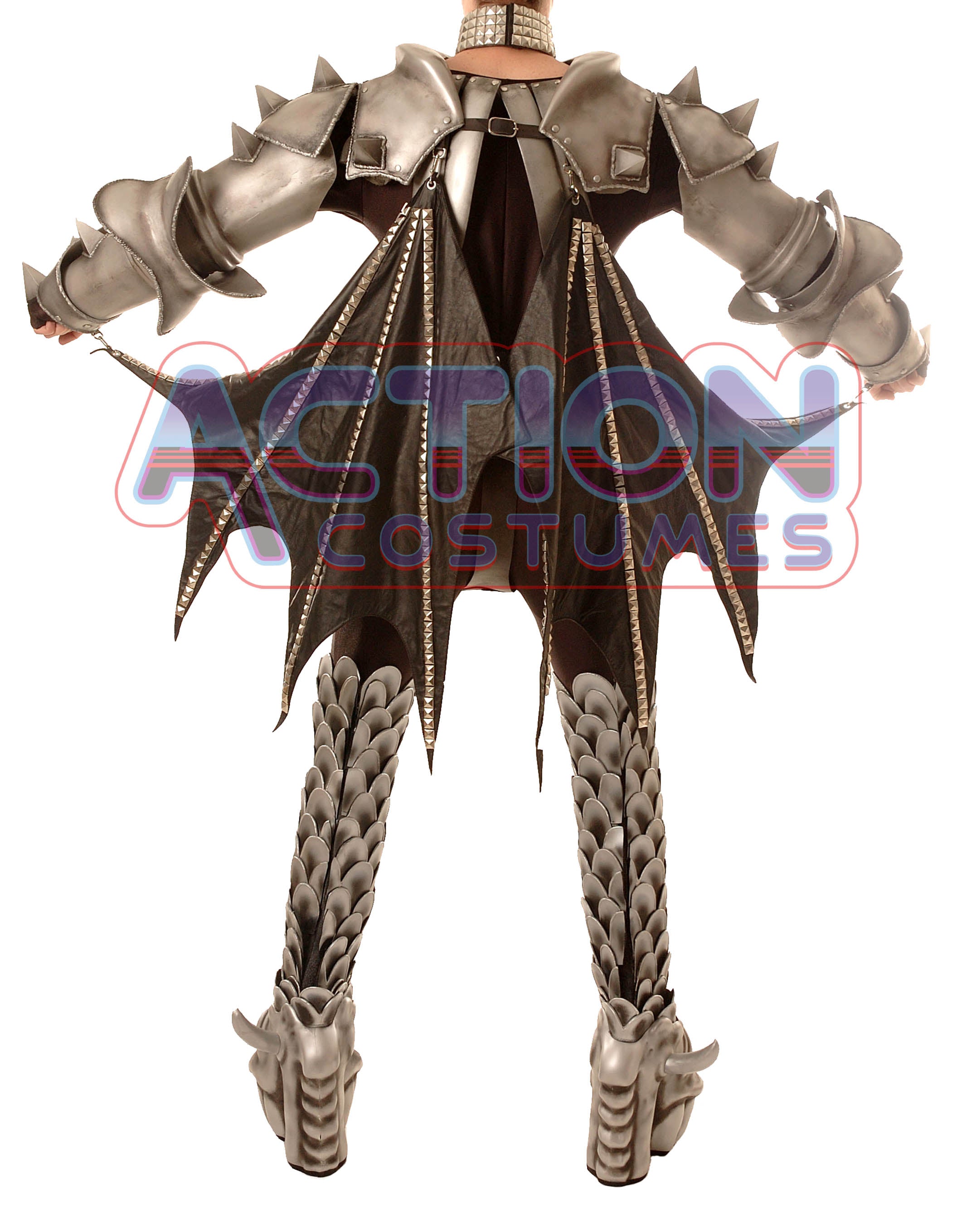 The wings were made of black leather and had the detailed of lines of pyramid rivets, and they are tied to the costume by little eyelets that hold with little hooks that are hidden in the armour.
