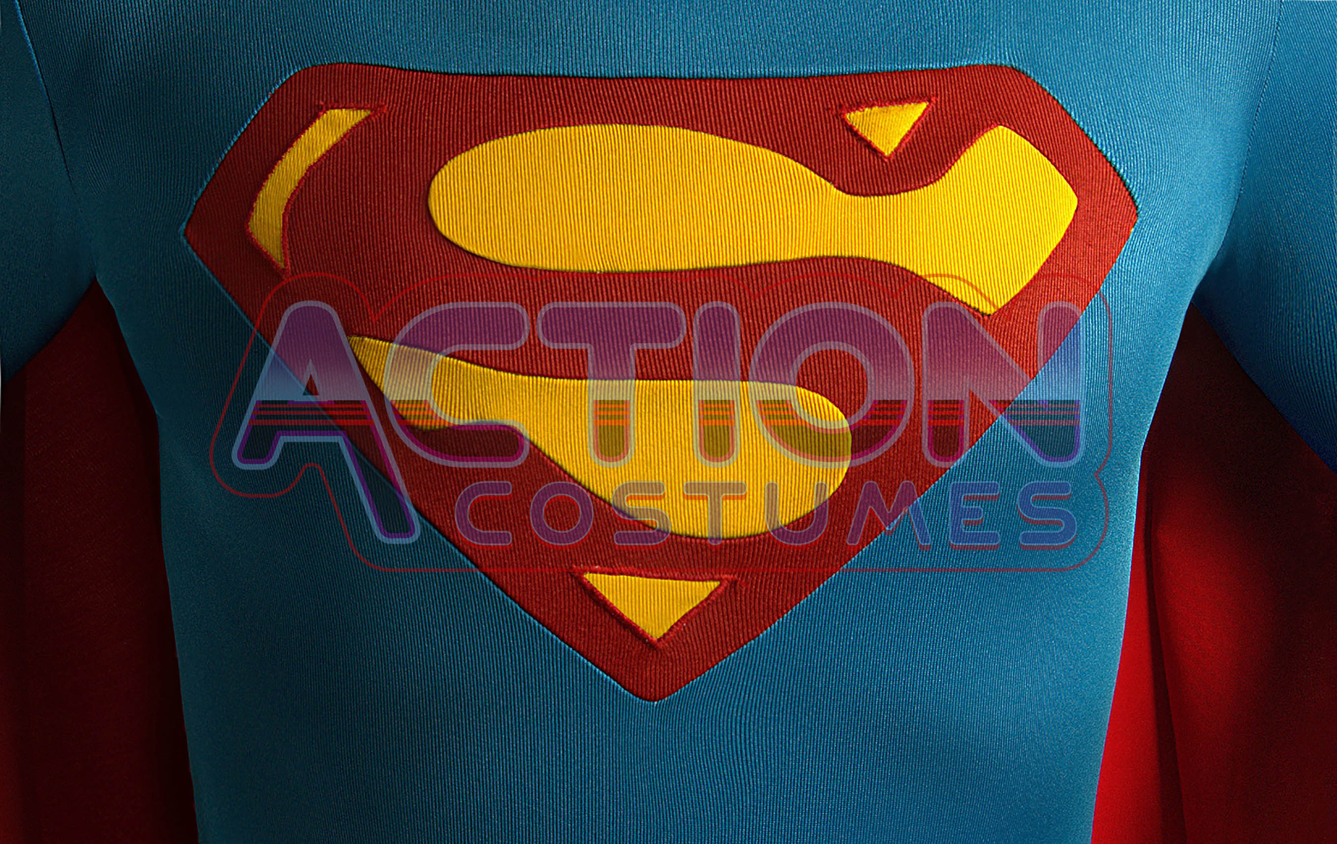 After a deep research, we improved the fabrics of the tunic. Now it is made of the most accurate Heavy Weight 4-way teal blue fabric instead of the 2-way one. This makes the costume more stretchy and comfortable. The tunic comes with the “S” emblem sewn in the chest and a back zipper. It brings the scarlet red trunks attached to it and has four belts Lycra loops. The shoulder seams have four golden press studs to attach the cape to the tunic plus an internal trick that make the cape hang in the correct place. These press studs and the back zipper have been made for this costume by our professional goldsmith. Besides, it has two seems on the back around the Zip. The teal blue fabric has the same texture and color as the original costume, nothing more accurate to the original costume has ever been seen. Just let the pictures speak for themselves!