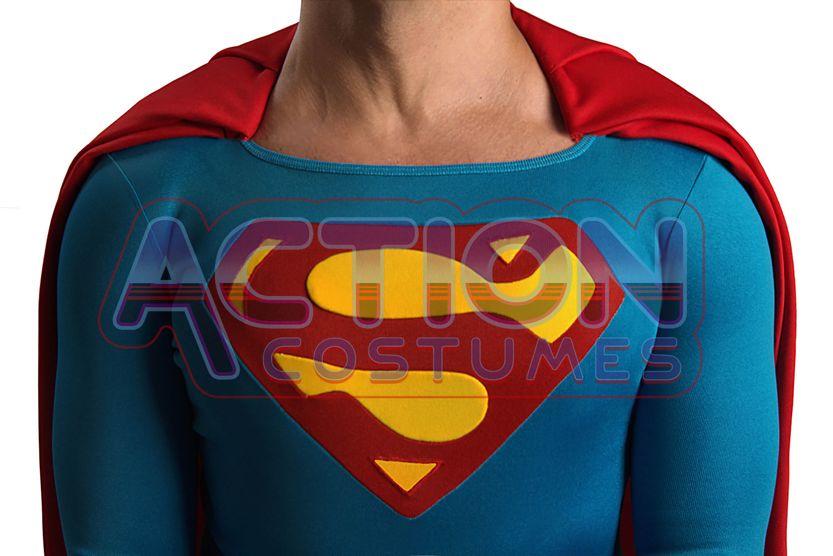 The great Tunic has been made with the most accurate Heavy Weight 2-way teal blue fabric (Not Lycra) with the "S" emblem sewn in the chest and a back zipper. This Tunic brings the scarlet red trunks attached to it and has four belts Lycra loops. The shoulder seams have four golden press studs to attach the cape to the tunic plus an internal trick that make the cape hang in the correct place. These press studs and the back zipper have been made for this costume by our professional goldsmith. Besides, it has two seems on the back around the Zip. The teal blue fabric has the same texture and color as the original costume, nothing more accurate to the original costume has ever been seen. Just let the pictures speak for themselves!