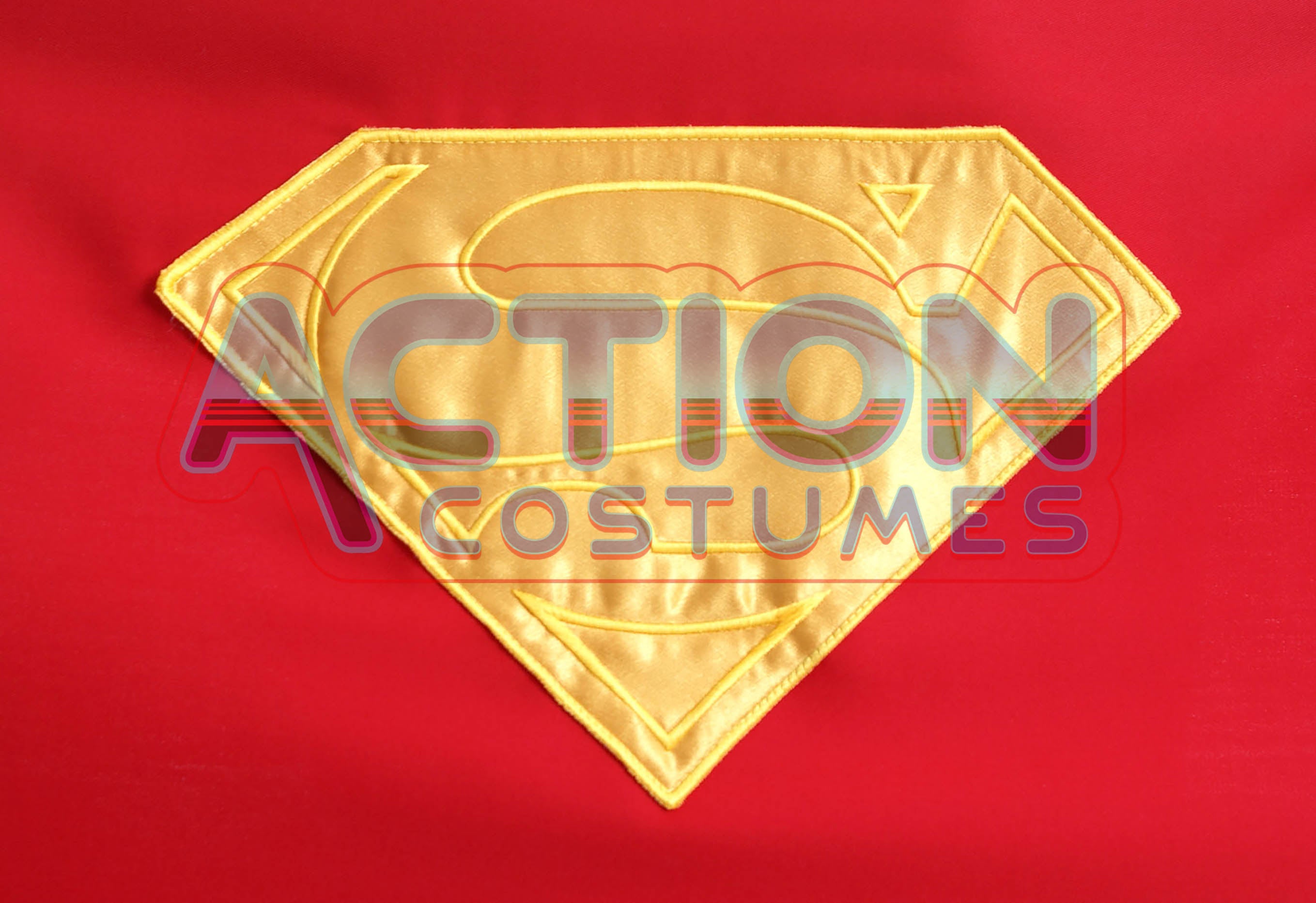 Both emblems on the costume have been professionally made in a soft and shiny material. Particularly, the front emblem is made in a shiny and soft red and yellow golden fabric and once made it has been sewn to the costume. The back one has been made of the same golden yellow fabric and has been attached to the cape with a warm system! Emblems are an incredible detail on this suit! Watch the pics!!