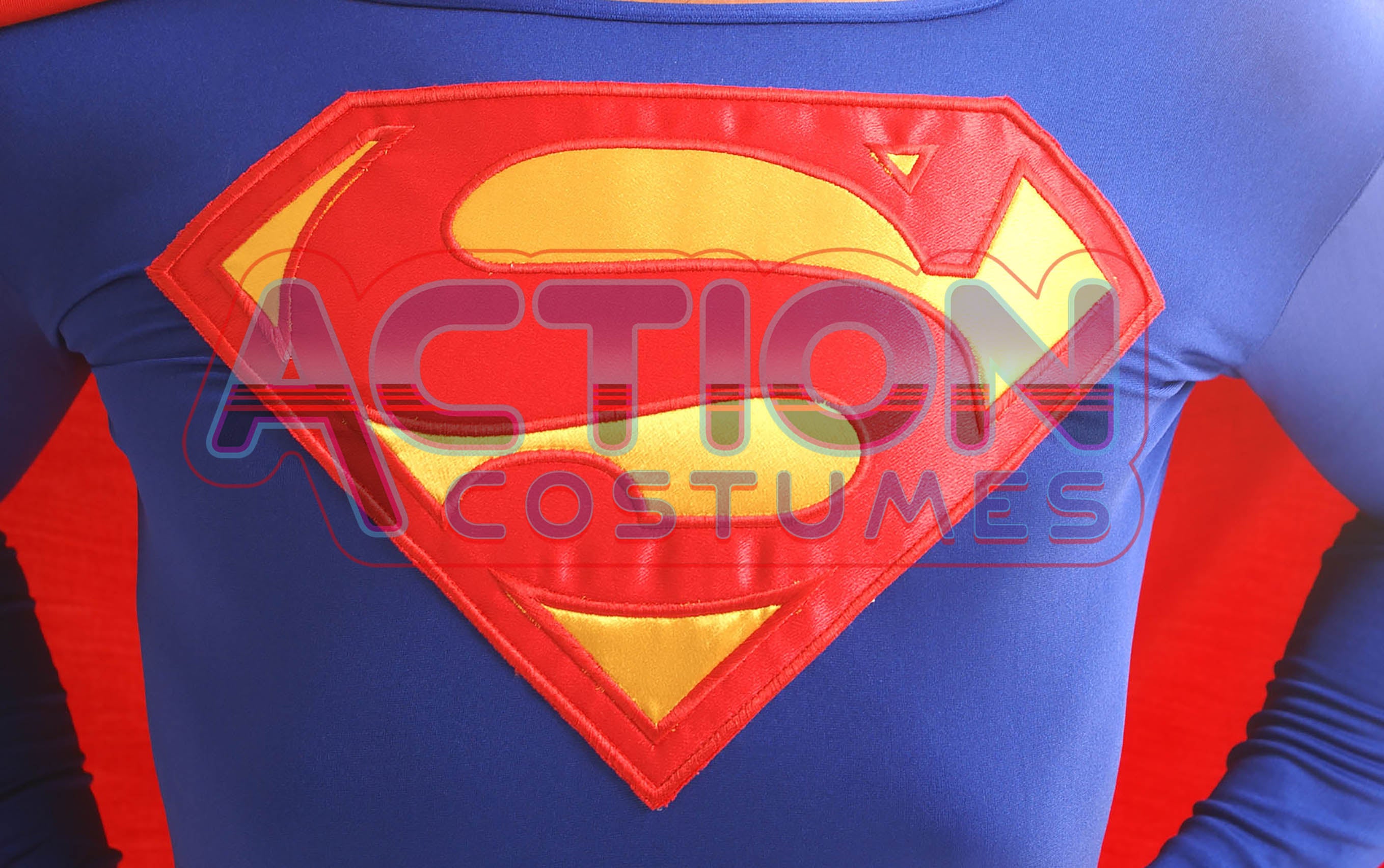 The Tunic has been made in 4-way dark blue Lycra spandex (shiny) with the “S” emblem and a back zipper, red Lycra spandex trunks attached to the tunic (with four belt Lycra loops).