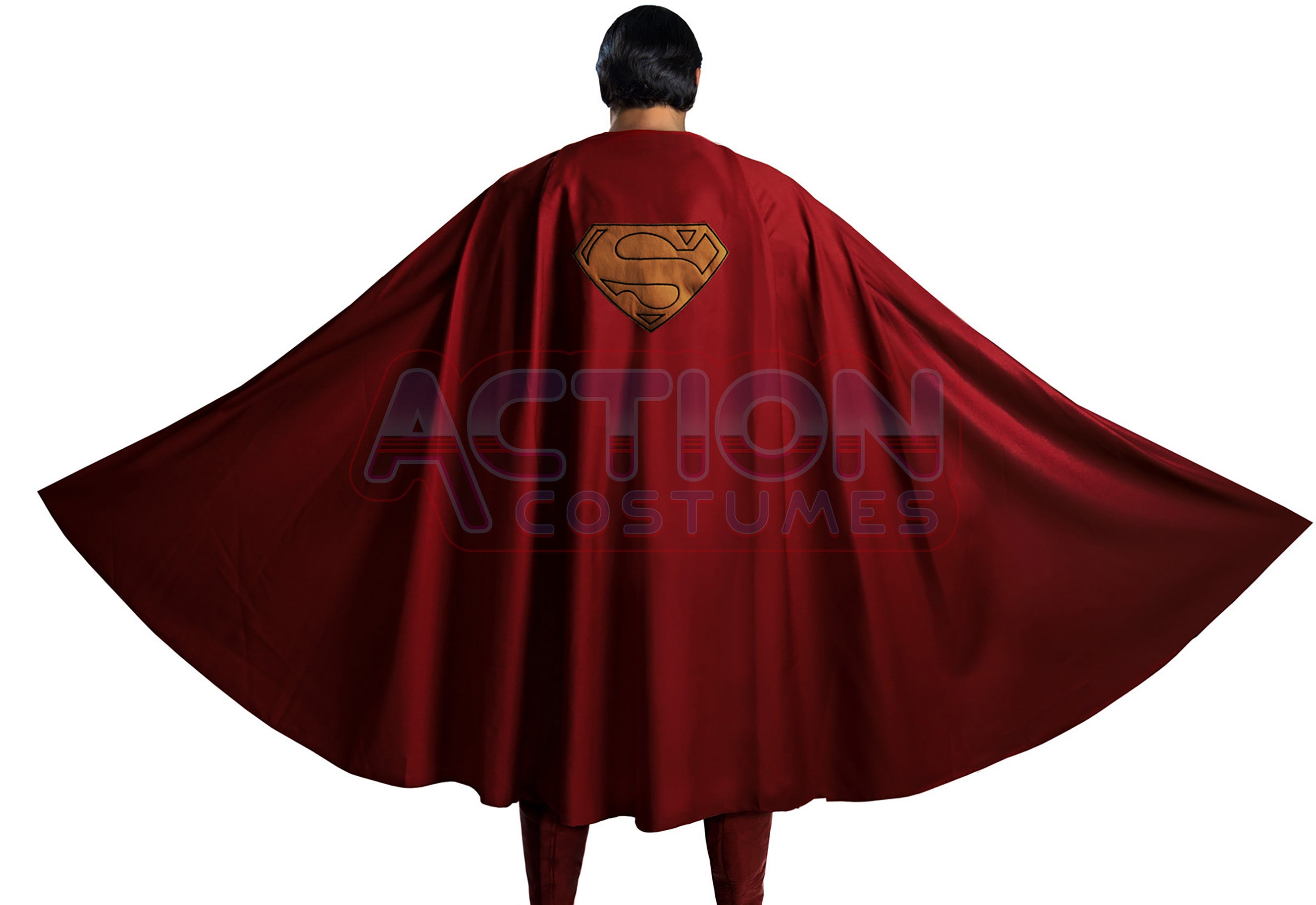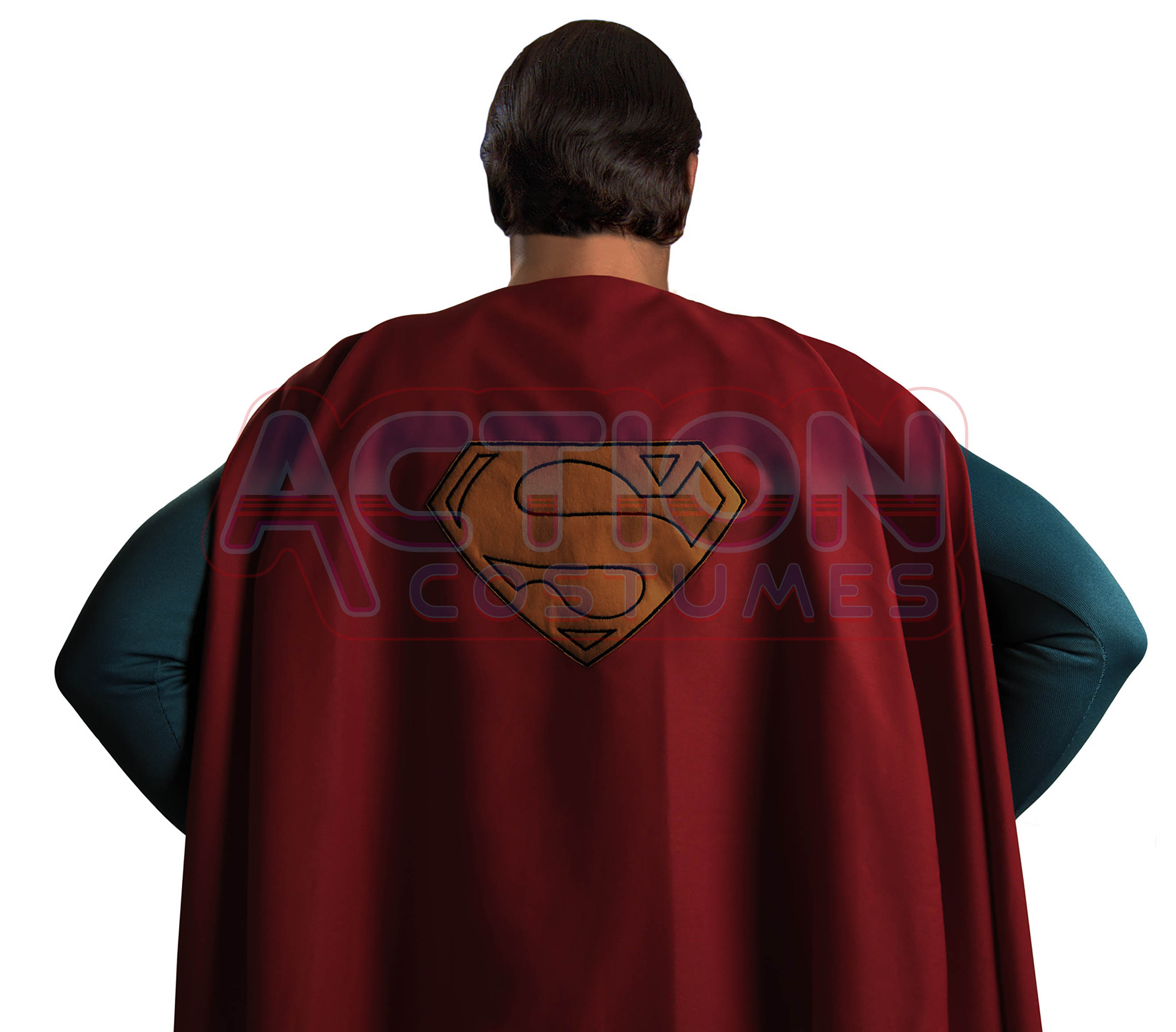 Bordeaux gabardine cape which ties under the arms in the back with a dark yellow emblem using the original measurements and shape as well. This dark yellow fabric has the correct yellow “evil” color. The back emblem has been made by an embroidery system, sewing the black thread to the dark yellow fabric. This cape attaches to the body with two strips that have the perfect fit and has four golden press studs that let the cape stay at the correct place of the tunic. We changed the material of the strips. Now they are made of the same red gabardine instead of bandoliers as the original costume had to provide greater comfort when wearing it. The customer can choose the material of the strips, whether it is bandolier or gabardine. However, if the customer doesn’t specify, we will make them of gabardine by default. After we seen the last of the two original costumes we were lucky enough to see inside the shoulders of the cape and realized which one is the inner material they used to make the flaps and we applied it into our capes to get them to look the perfect shape. The cape has the original measurements as the screen used in Superman “The Movie” and has an incredible flow! The finish of this cape had been made with thread sewn by hand.